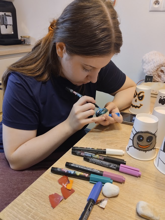 V rámci môjho lokálneho projektu Piatky s Aničkou sme pre deti pripravili tematické halloweenske dielničky plné kreativity, fantázie a dobrej nálady. Deti mali možnosť zapojiť sa do viacerých tvorivých aktivít, pri ktorých si rozvíjali svoju šikovnosť a predstavivosť. Spoločne sme vyrábali milé aj strašidelné postavičky z kameňov, ktoré deti s nadšením maľovali a zdobili podľa vlastných nápadov. Veľký úspech malo aj tvorenie z papierových pohárov, z ktorých vznikli originálne strašidielka a halloweenske dekorácie. Nechýbalo ani kreslenie obrázkov s halloweenskou tematikou, pri ktorých deti naplno využili svoju fantáziu. Halloweenske dielničky boli pre deti nielen zábavou, ale aj príležitosťou stráviť spoločný čas v príjemnej atmosfére. Teší nás ich radosť z tvorenia a veríme, že si zo spoločných piatkov odniesli pekné zážitky aj vlastnoručne vyrobené výrobky.